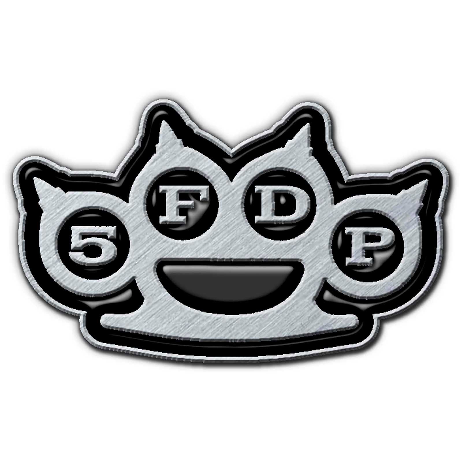 An official licensed metal Pin Badge featuring the Five Finger Death Punch 'Knuckles' design motif.