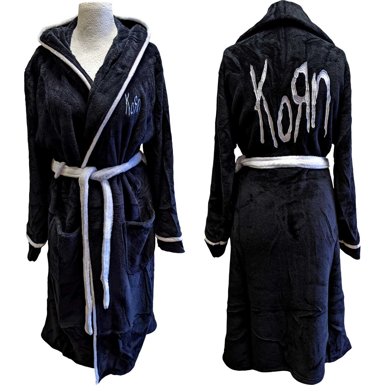 An official licensed Korn Unisex Bathrobe featuring the 'Logo' design motif. This high quality Bathrobe is available in a black & white colourway.