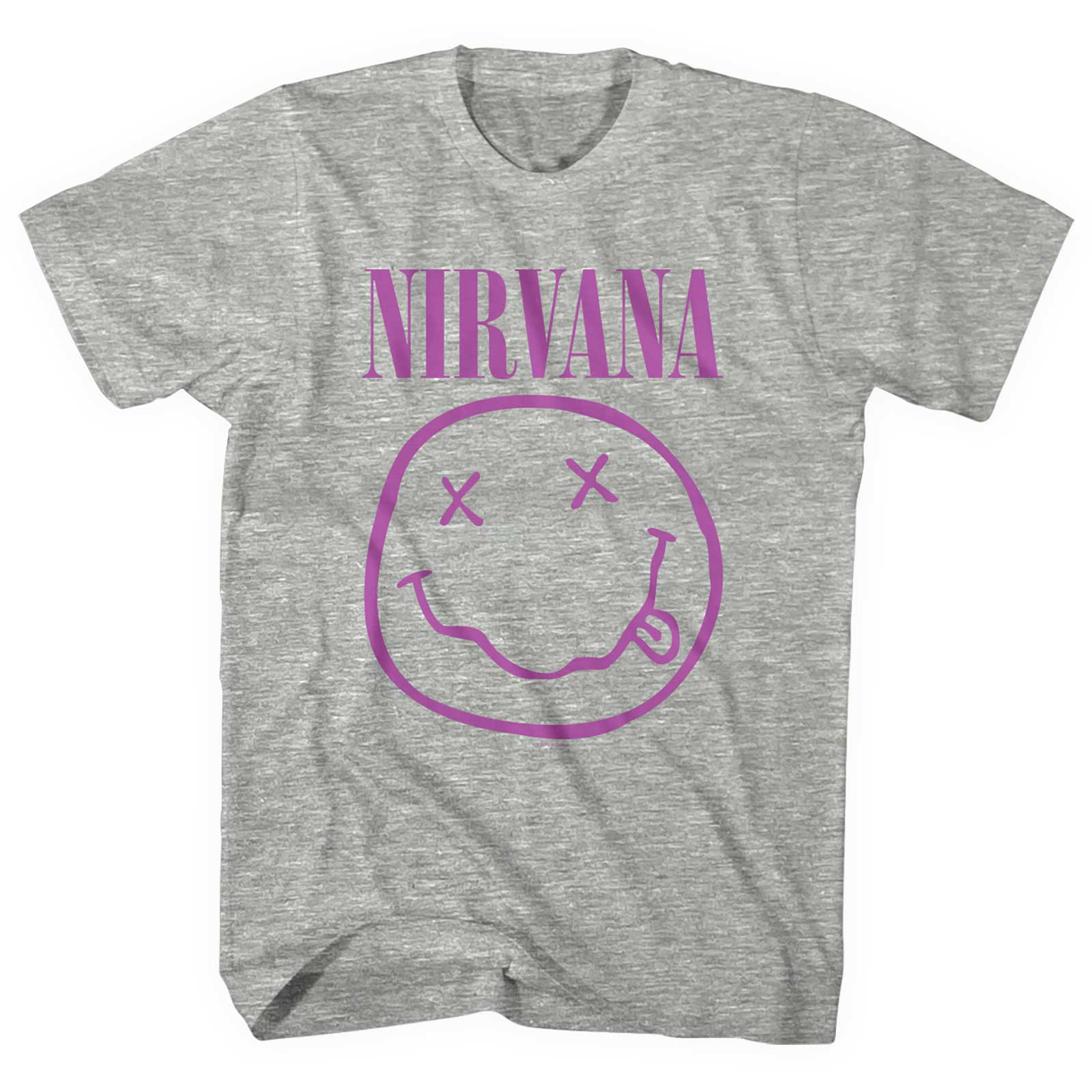 An official licensed Nirvana Unisex T-Shirt featuring the 'Purple Happy Face' design motif. This high quality T-Shirt is available in a grey colourway.